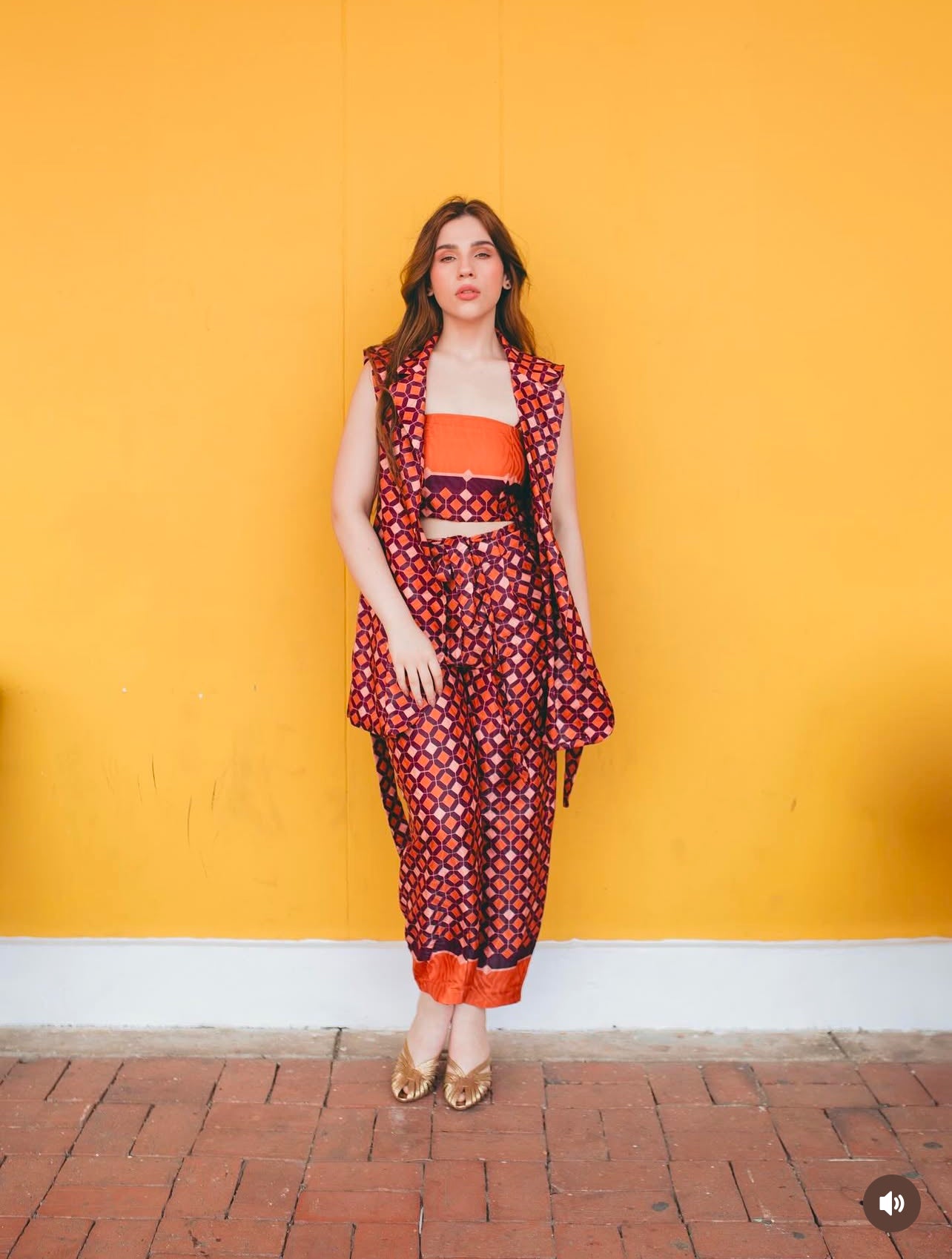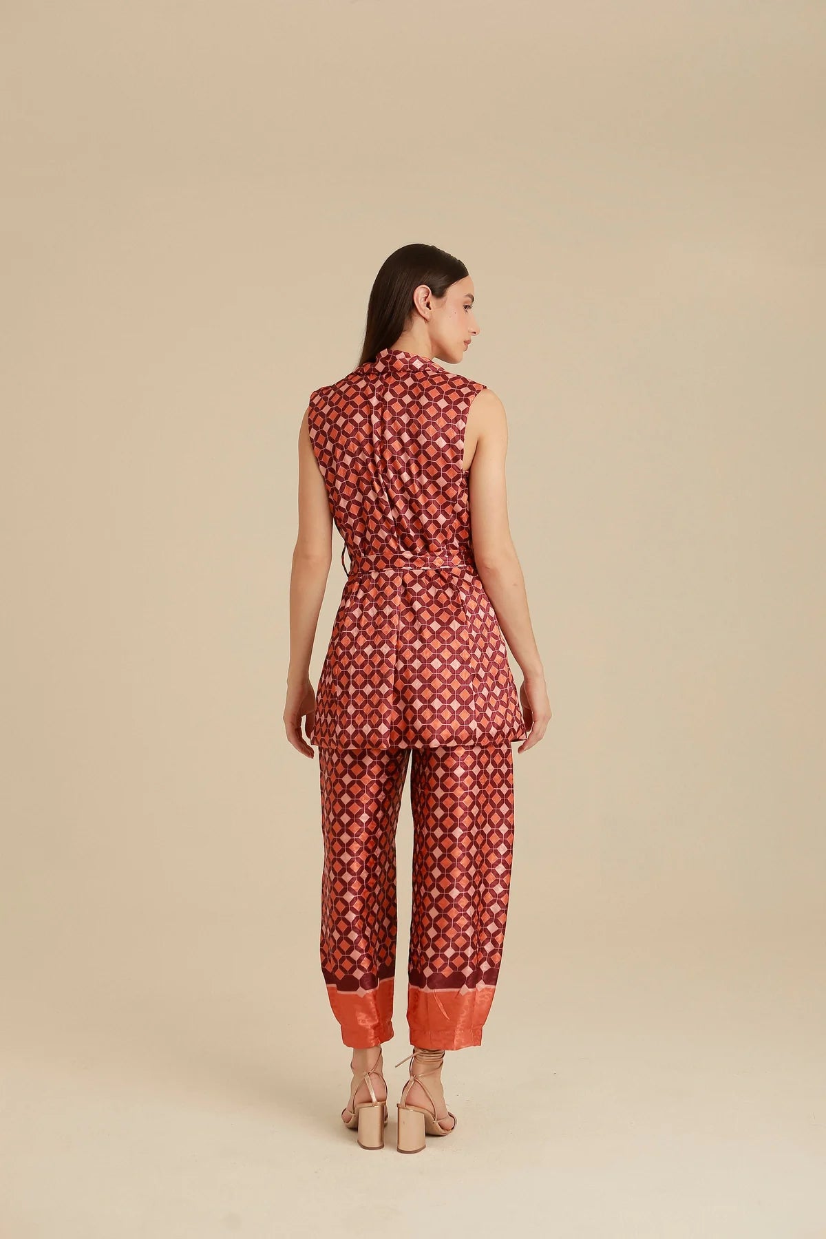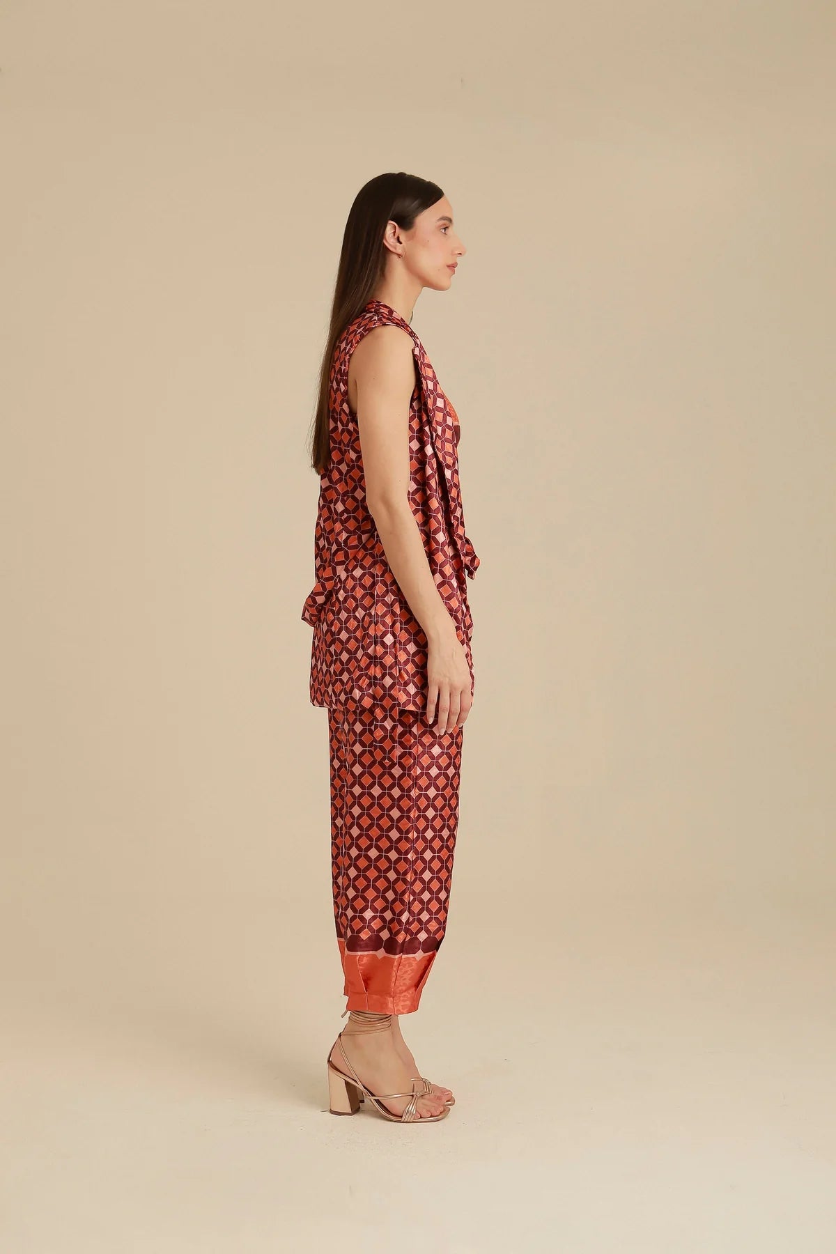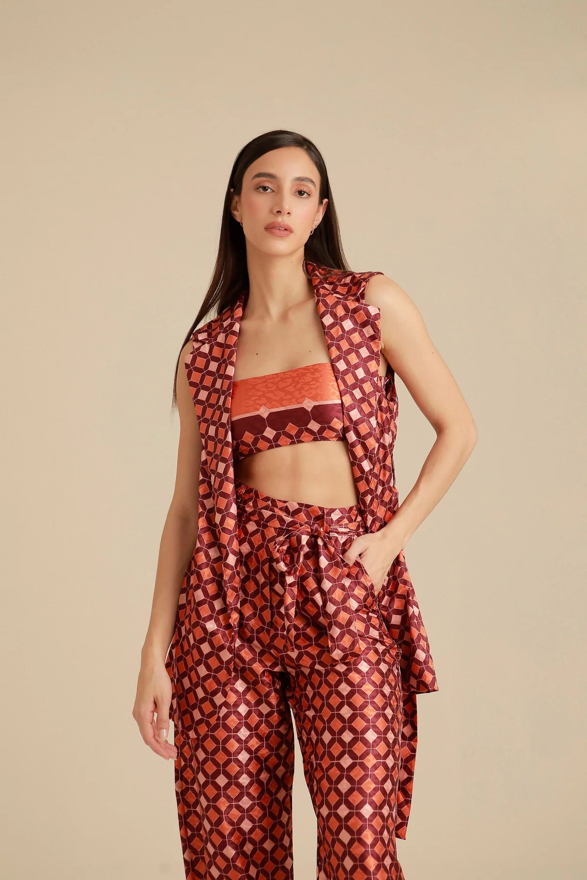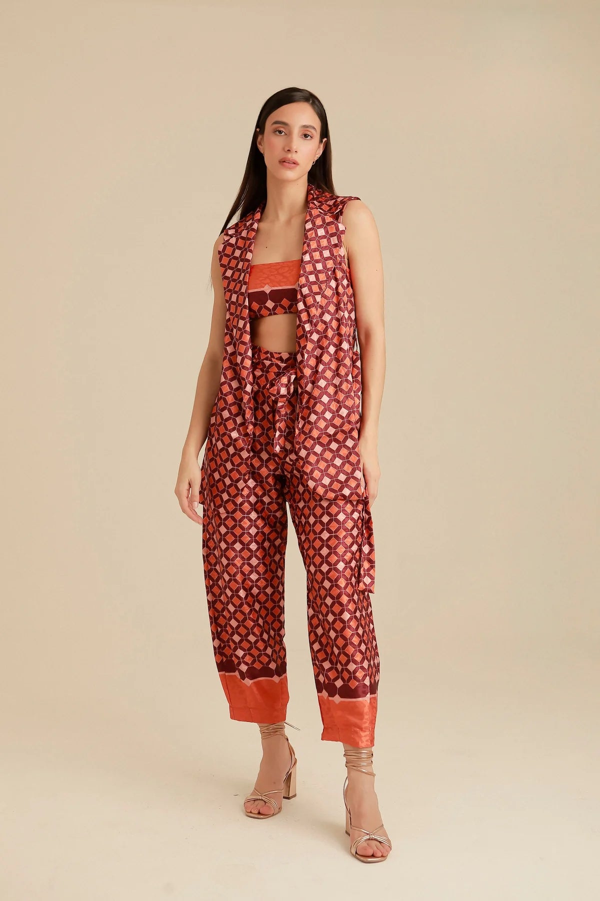 A 3 piece pant set with long sleeveless vest, crop top and crop matching pants.