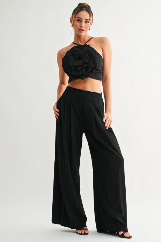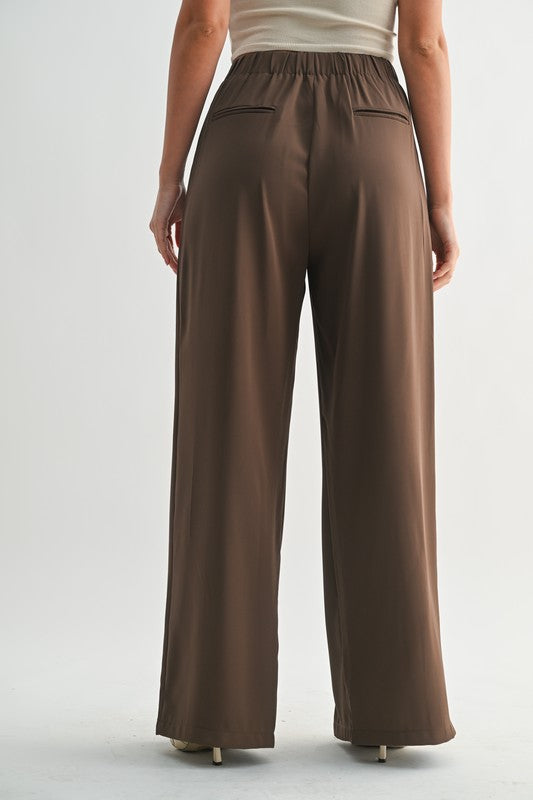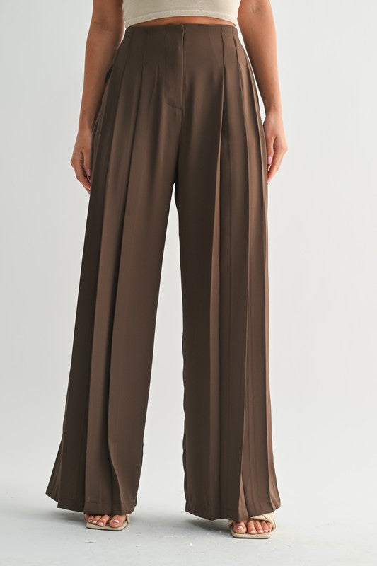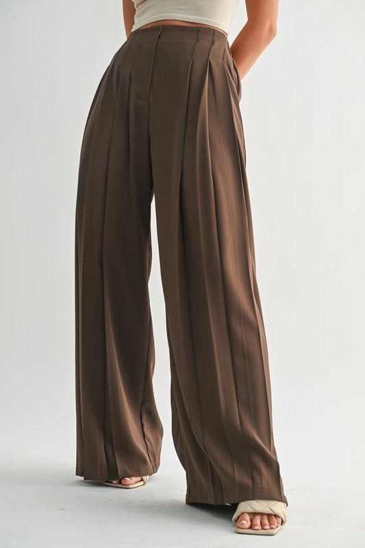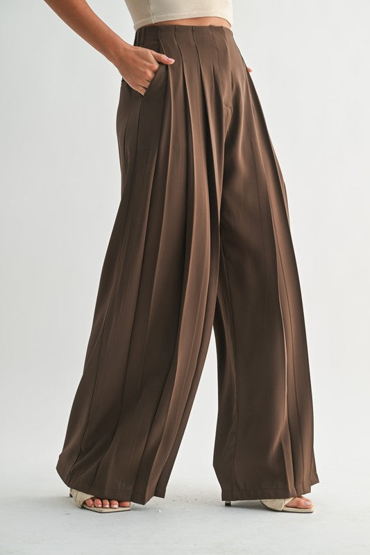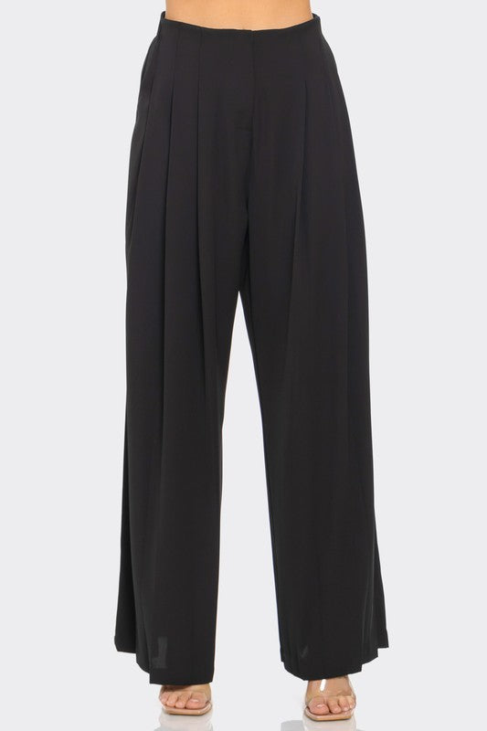 Pleated wide leg trousers. Front zipper and elastic back waistband.