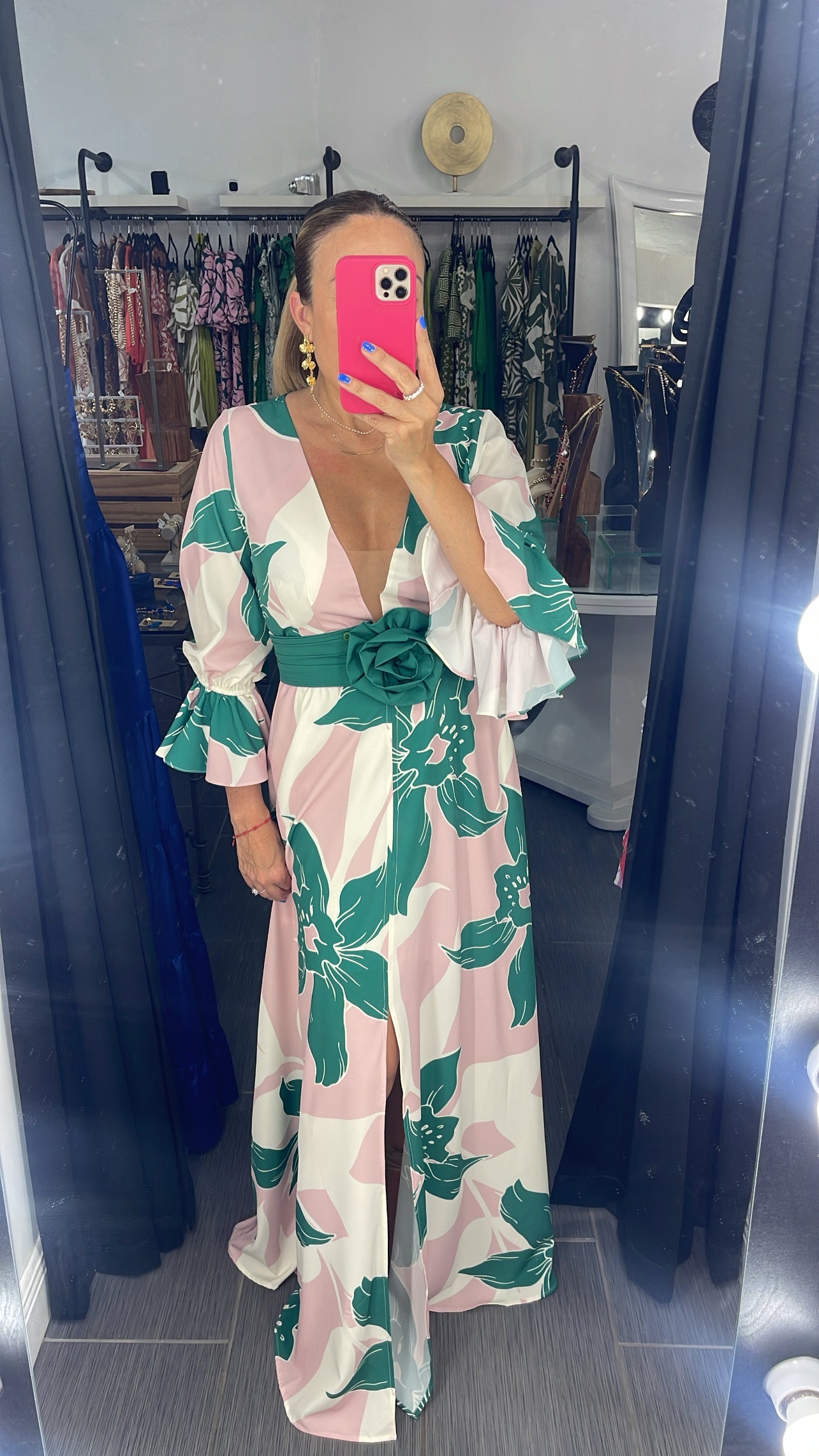 Long sleeves with ruffle at end of sleeves. V-neck with mesh detail and belt with flower.