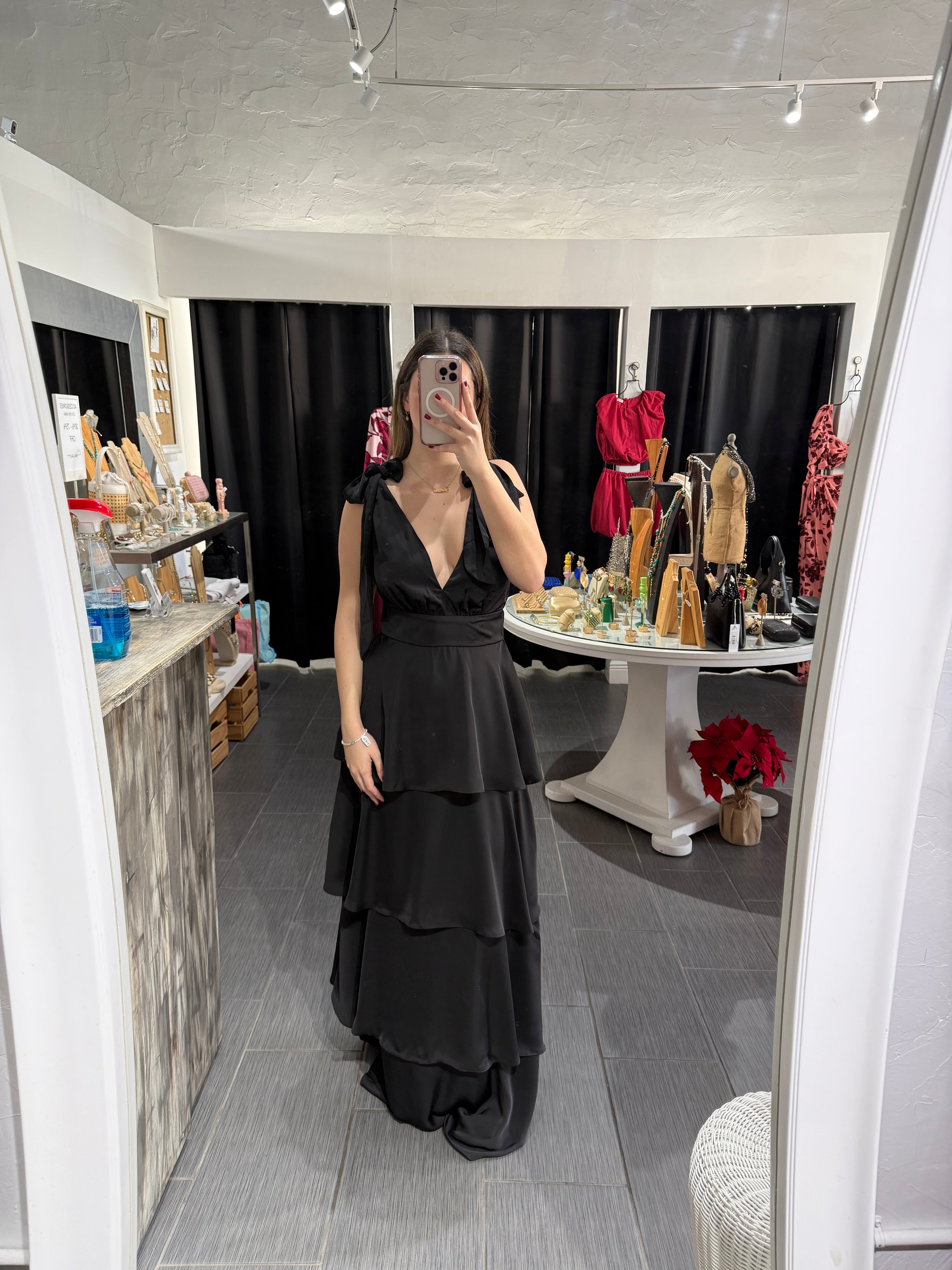 Shoulder tie multi-tier long dress. Back zipper.