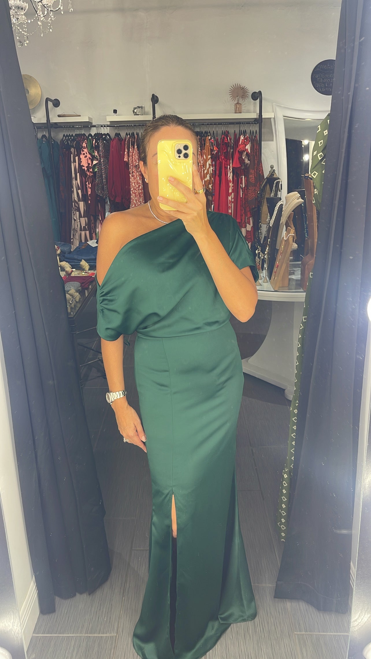 Asymmetrical one shoulder silky dress with side slit.