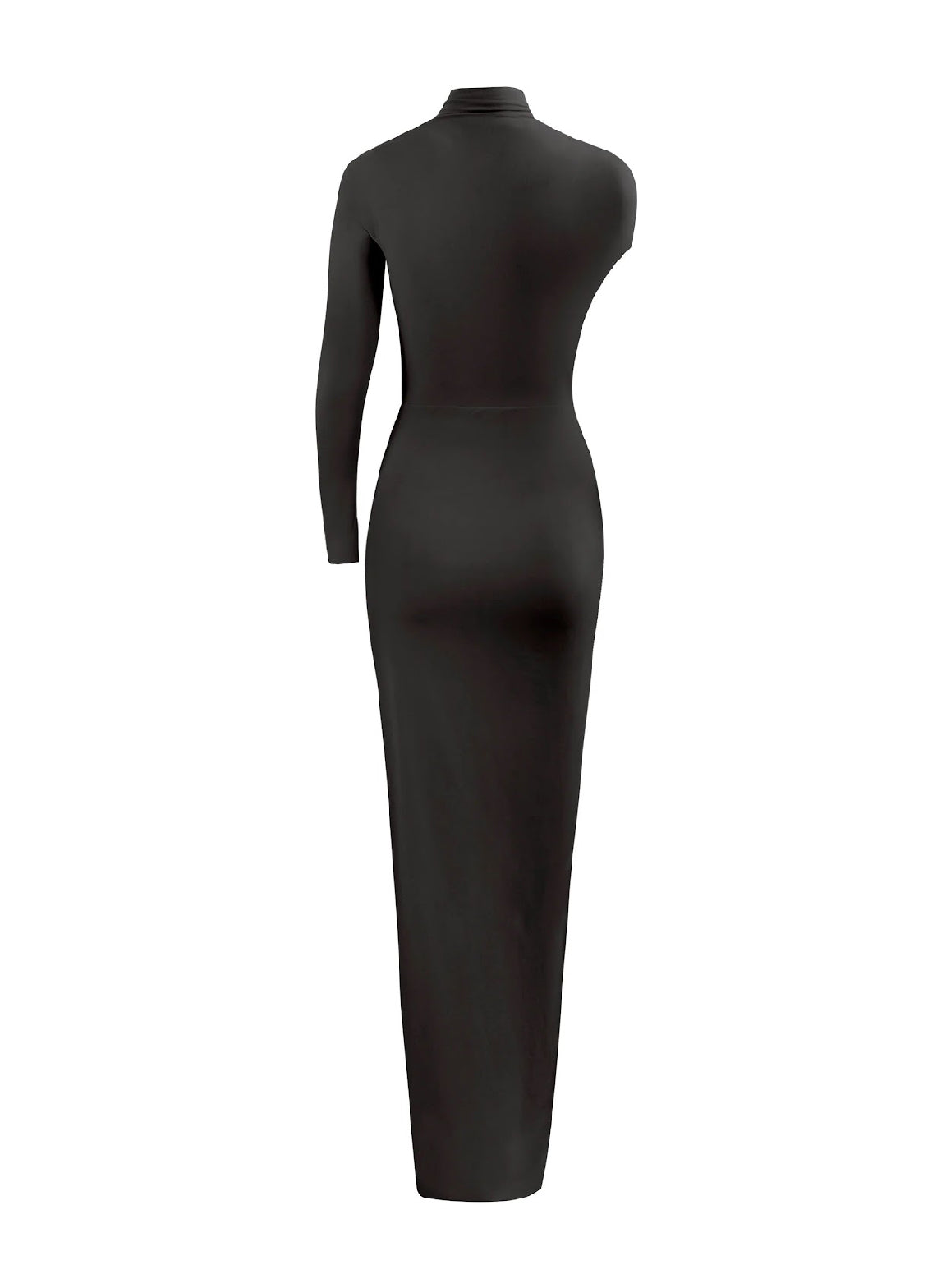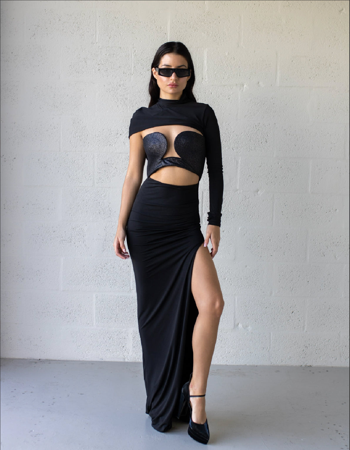 2 piece dress. One long sleeve with a cap sleeve on the other shoulder fitted long dress. Front cut out and paired with a crop top. Dress has a side slit.