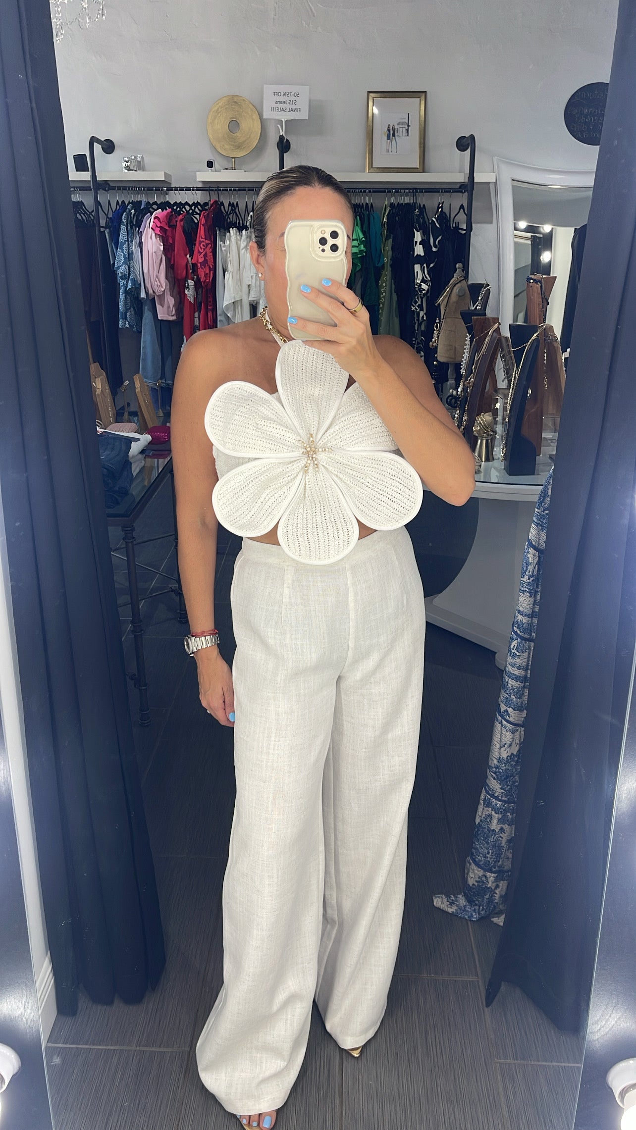 Crochet flower halter top with matching linen pants. Open back and tie.