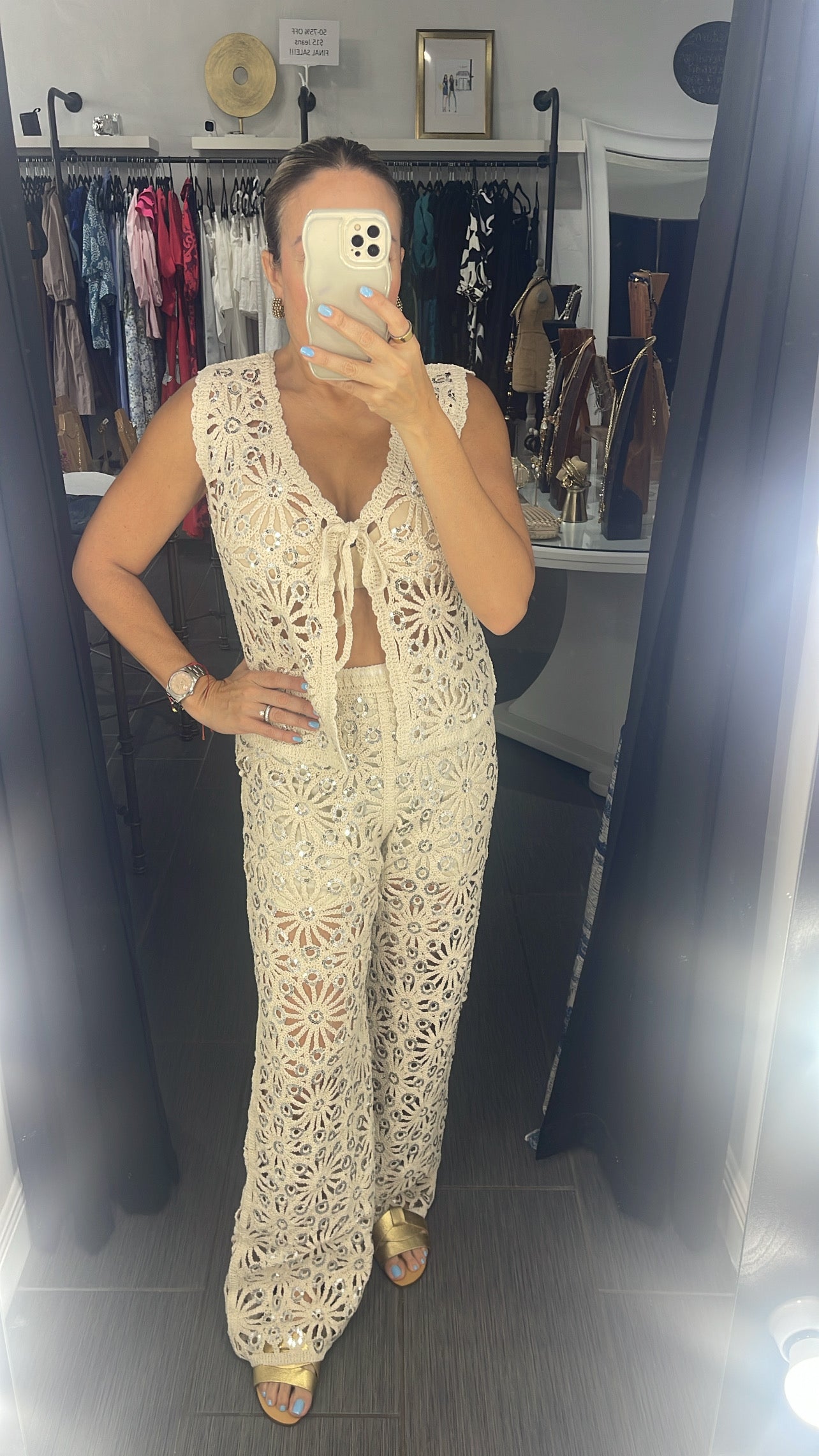 Crochet vest top and matching pants. Elastic waist.