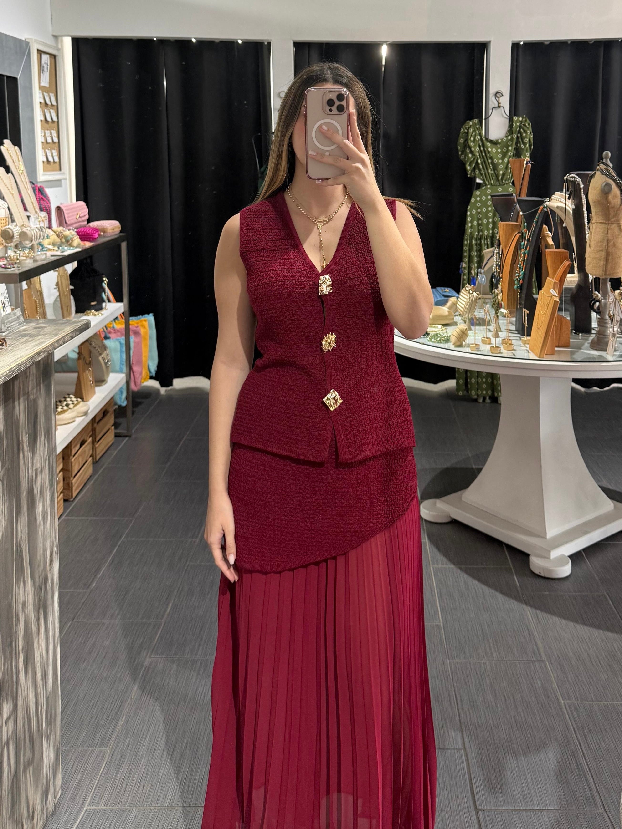 Knit vest with gold detail buttons and matching asymmetrical knit skirt with half sheer fabric.