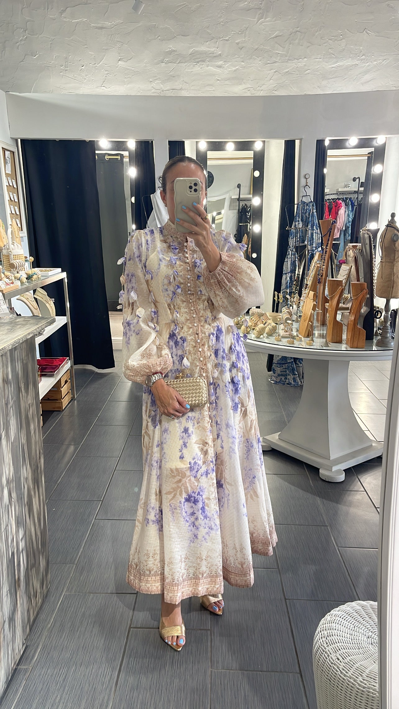Long sheer floral button down dress with nude slip underneath. Fringe floral details. Back zipper.