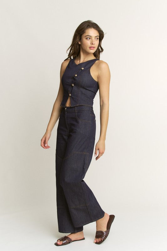 Denim asymmetrical vest with gold buttons and matching wide leg soft jeans.