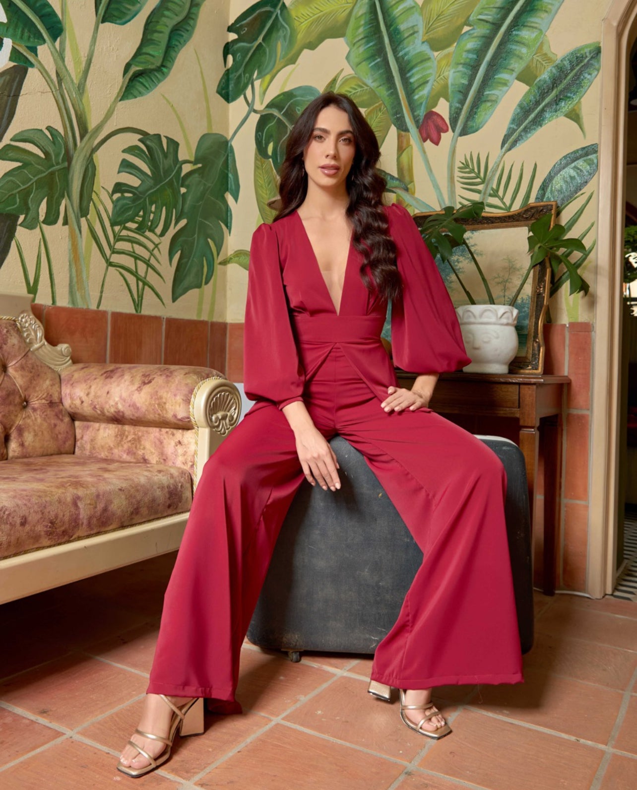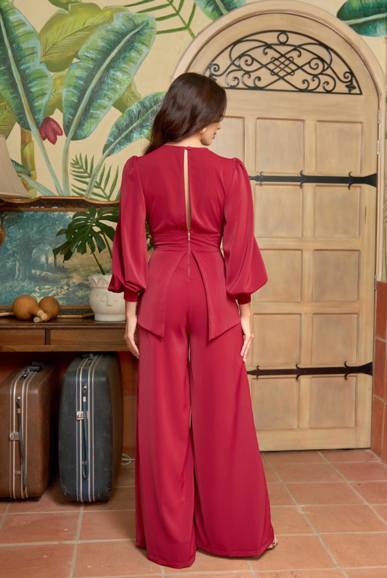 Long sleeve and v neck with mesh detail. Jumper has an overlap detail which makes the look like a two piece but in reality, it's a jumper. Back zipper.