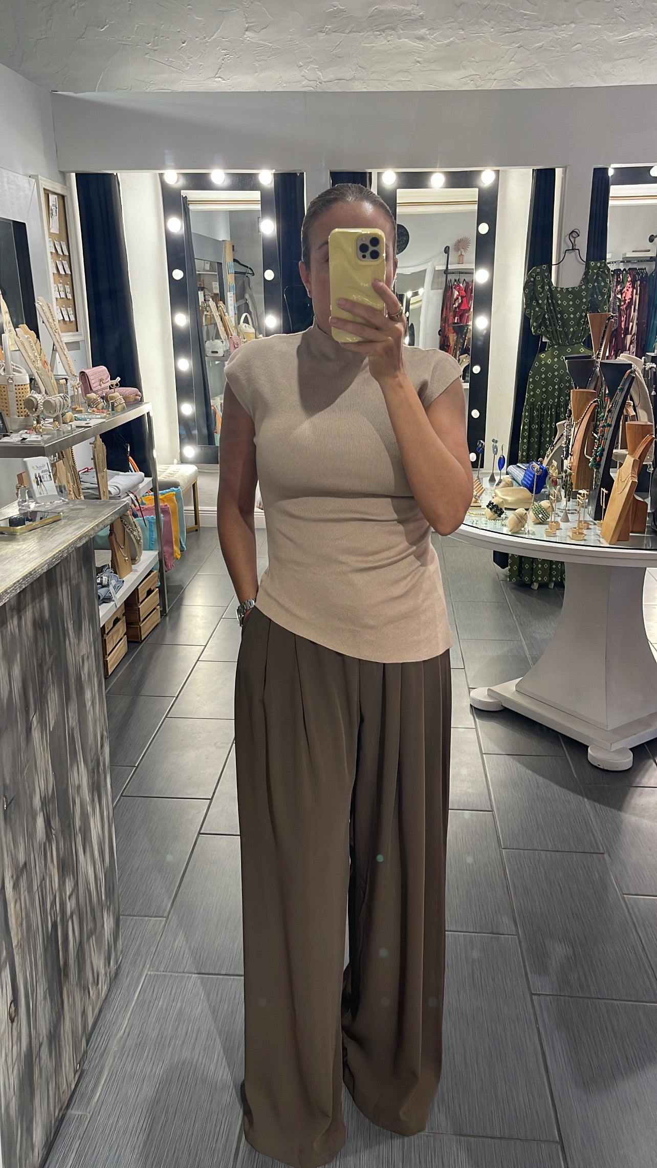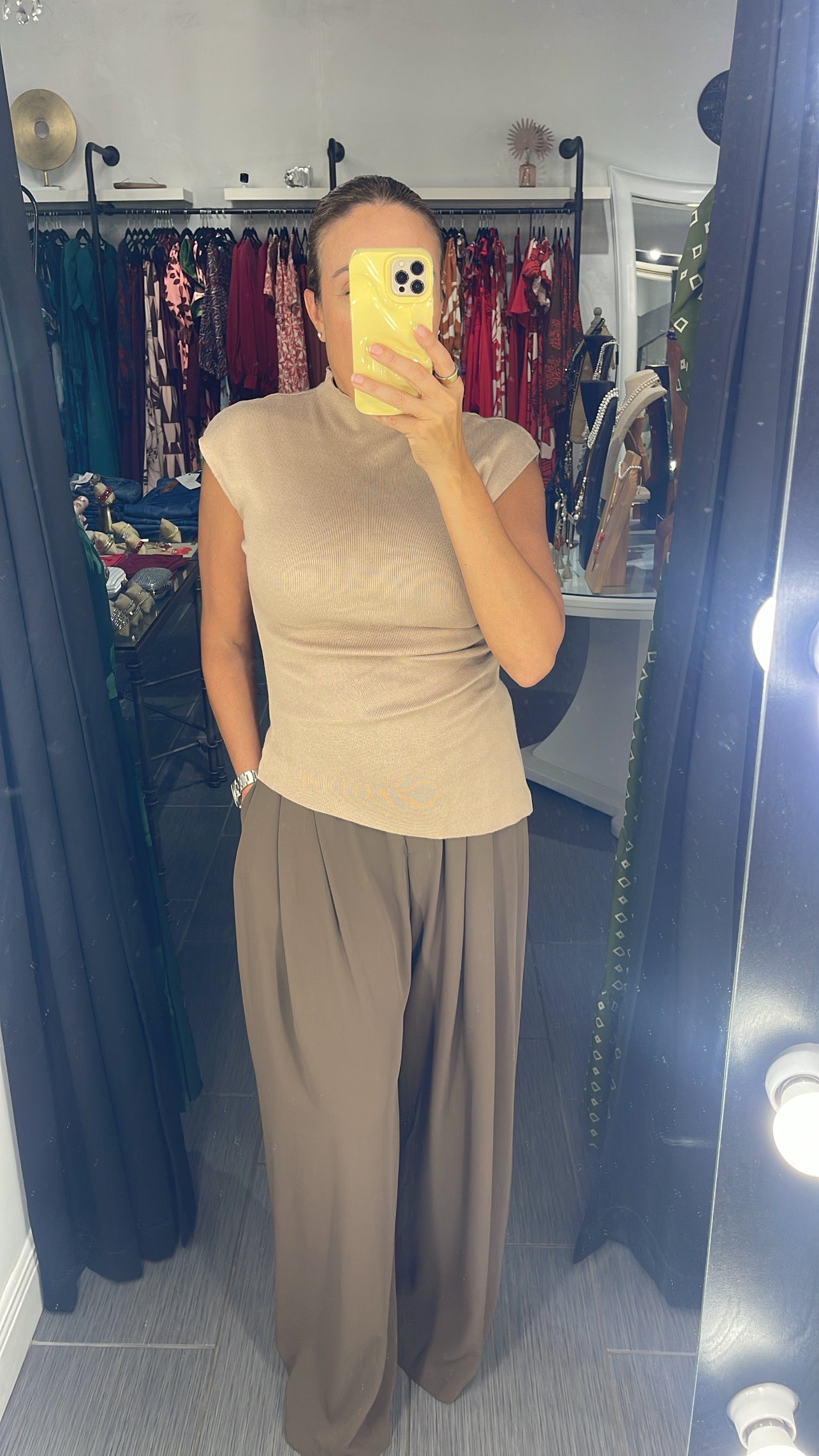 High neck sleeveless top with side pleat detail.