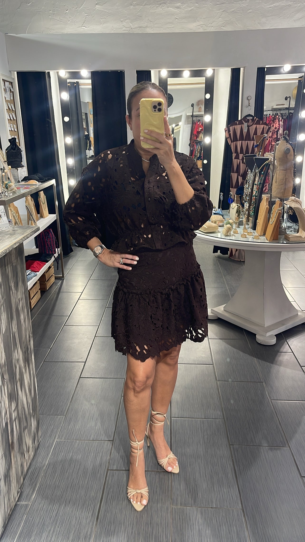 Laser cut long sleeve button down top with the matching short skirt.