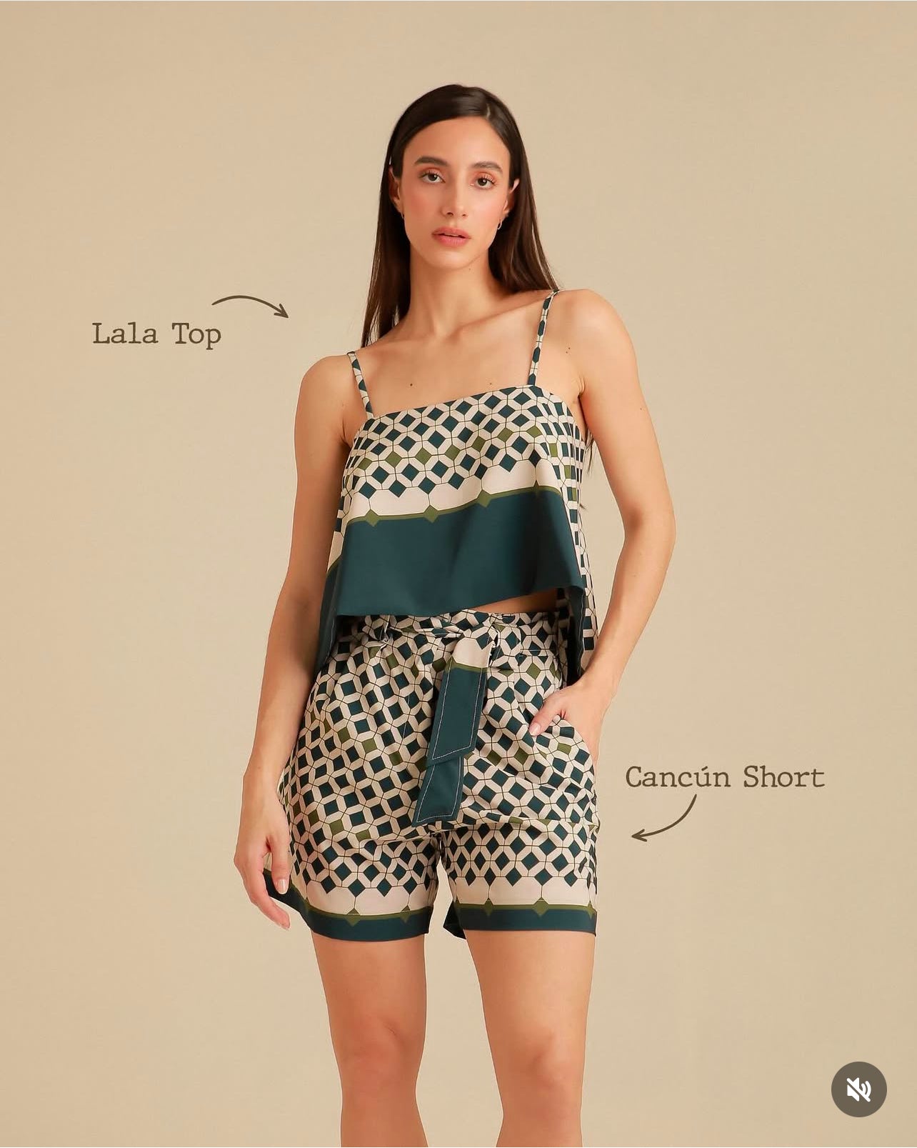 Thin strap flowy crop top with high waisted matching shorts with belt.