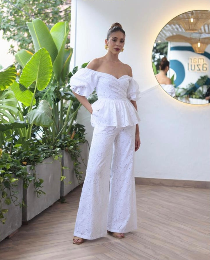 Off shoulder, puffy sleeves peplum top with matching pants.