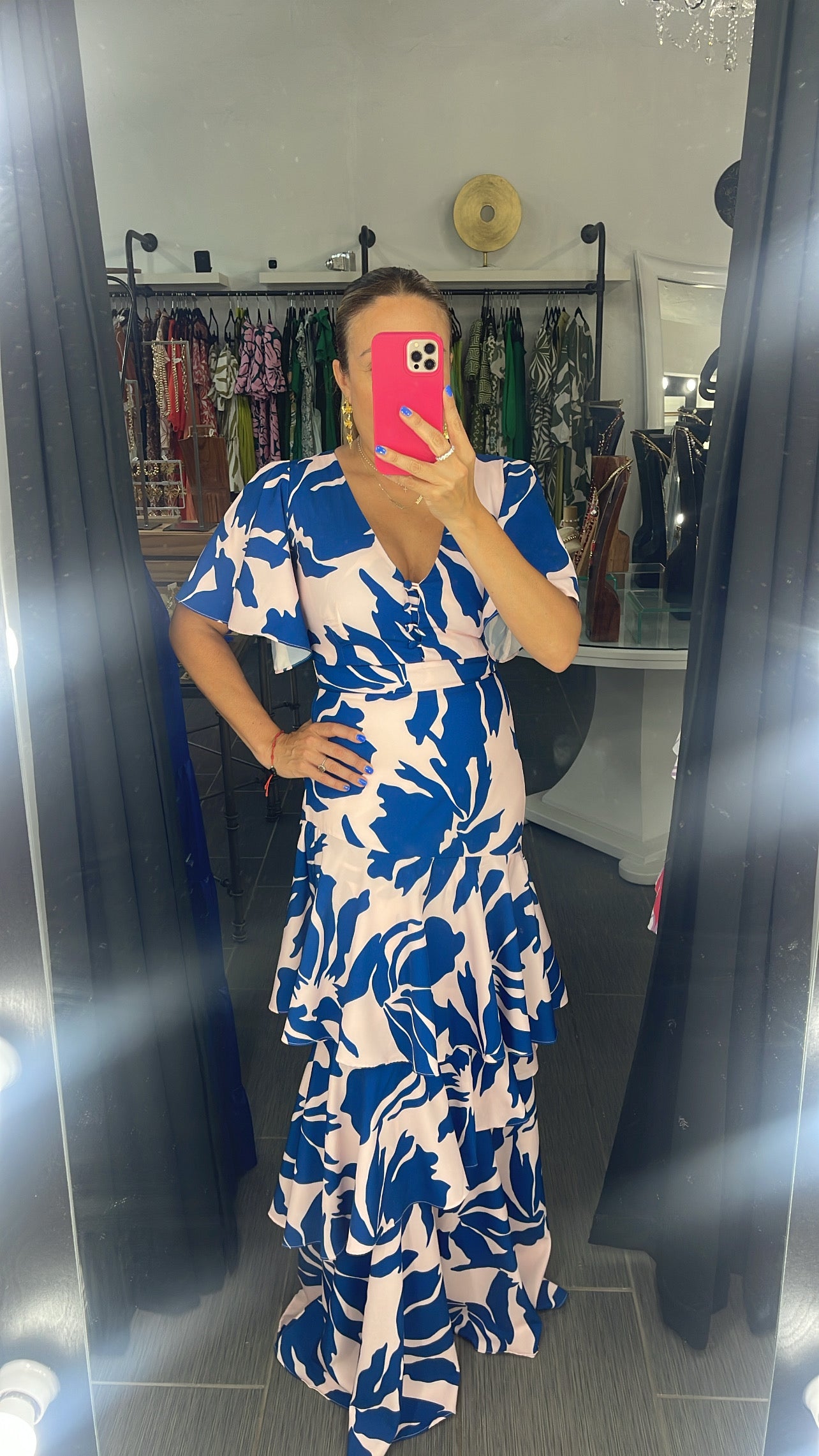 Cap ruffle sleeves and button detail in front with tiered ruffle hems dress.