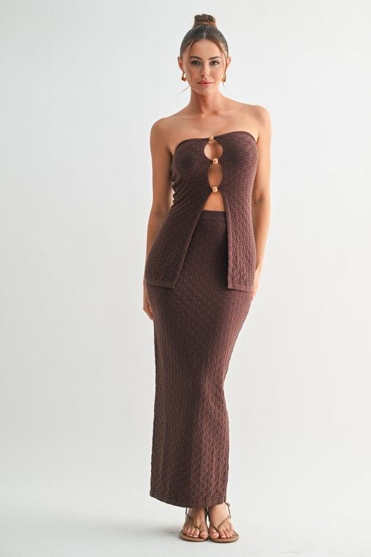 Fitted strapless long knitted top with cut outs and matching knitted fitted maxi skirt.