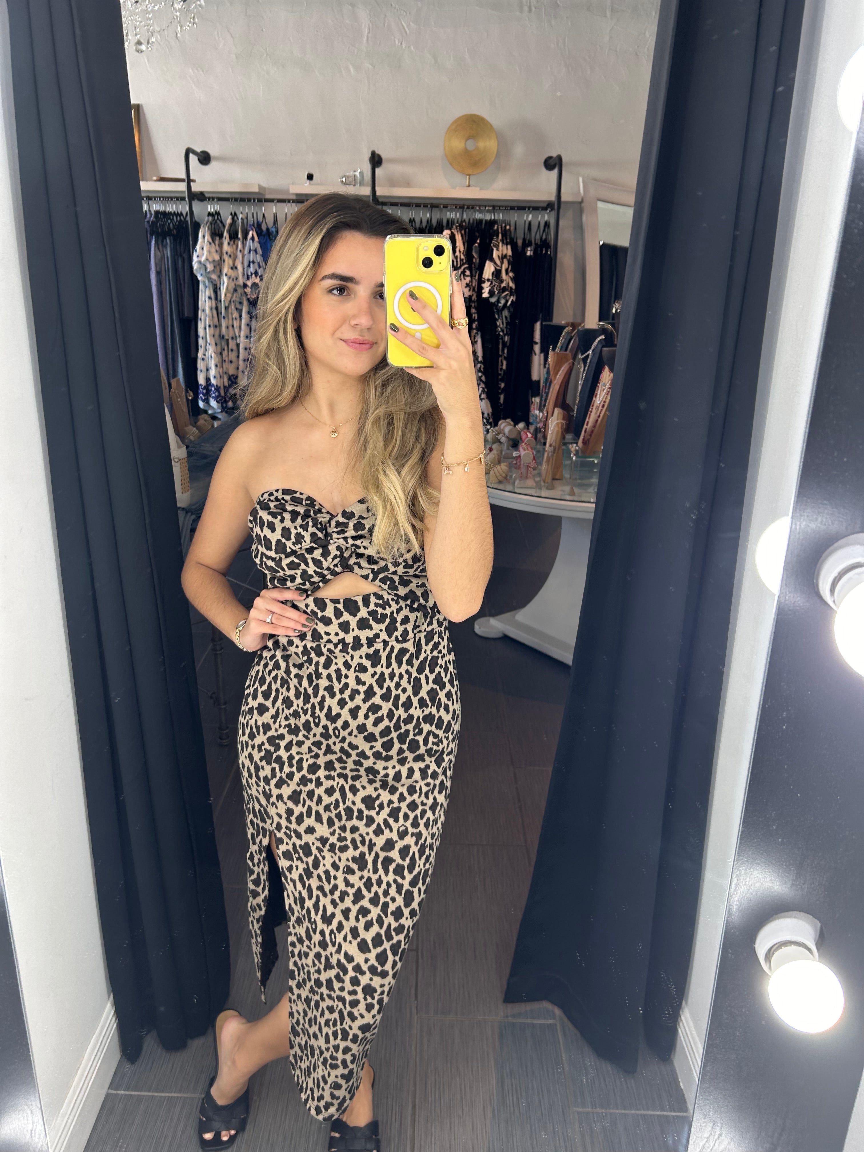 Strapless dress with front twist and cut out.