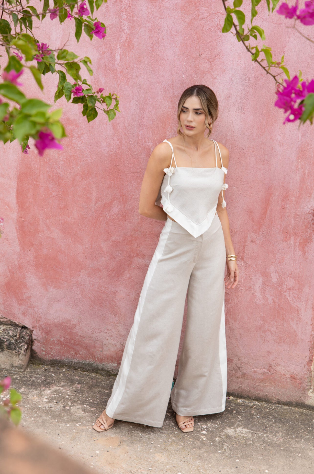 Thin straps with flower details scarf top with open back and tie paired with matching pants. Front zipper.