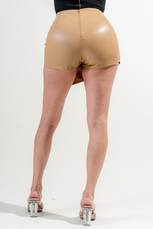 Wrap layered shorts with side ring knot. Back zipper. Faux leather.