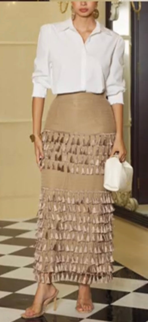 Button down long sleeve shirt with sleeve elastic detail and paired with a beautiful knit skirt with fringe details all over. Back zipper.