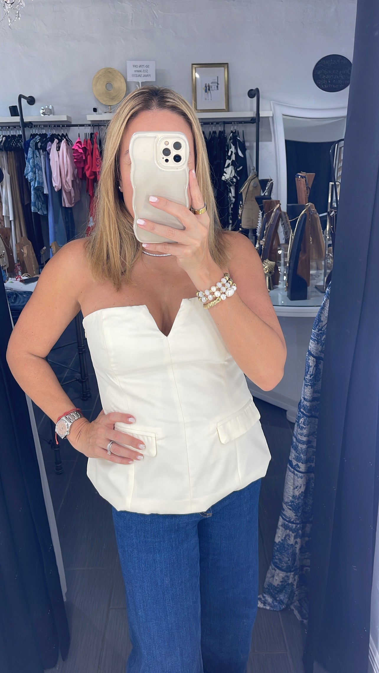 Strapless top with v cut out and pocket detail. Side zipper.