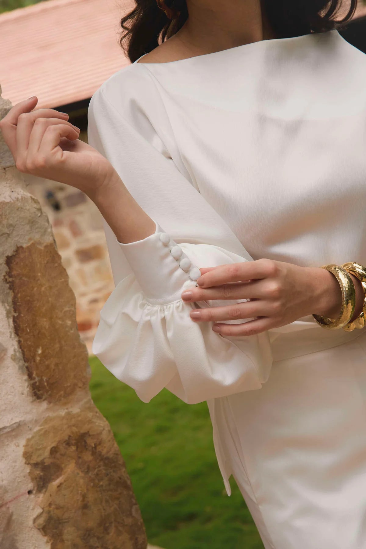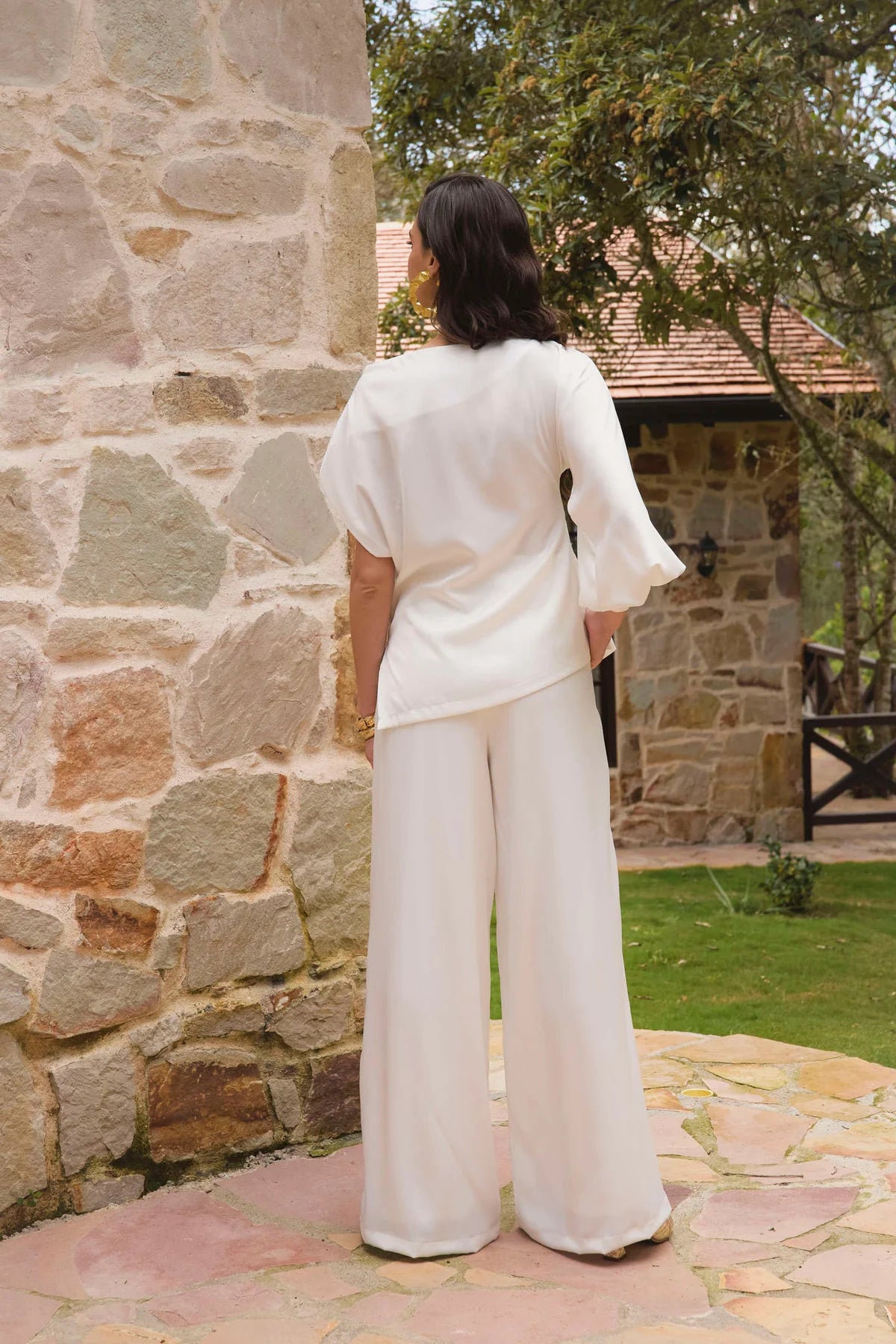 Asymmetrical top with one long sleeve and the other short sleeve.