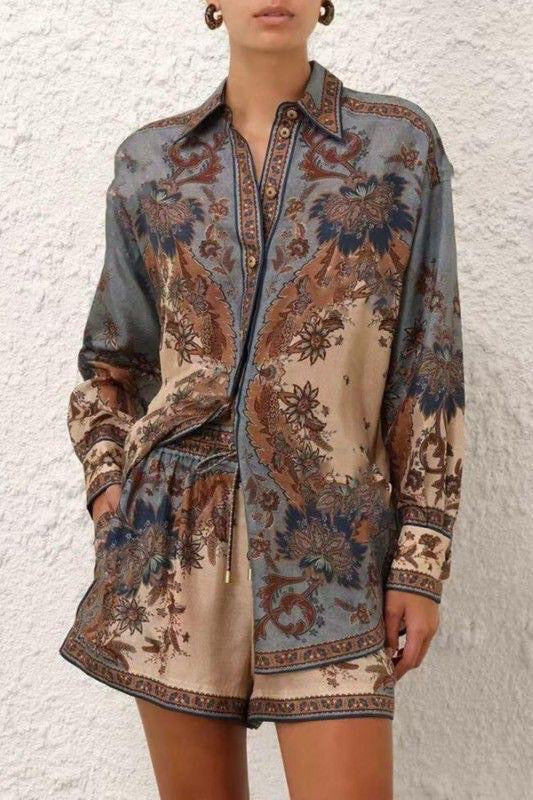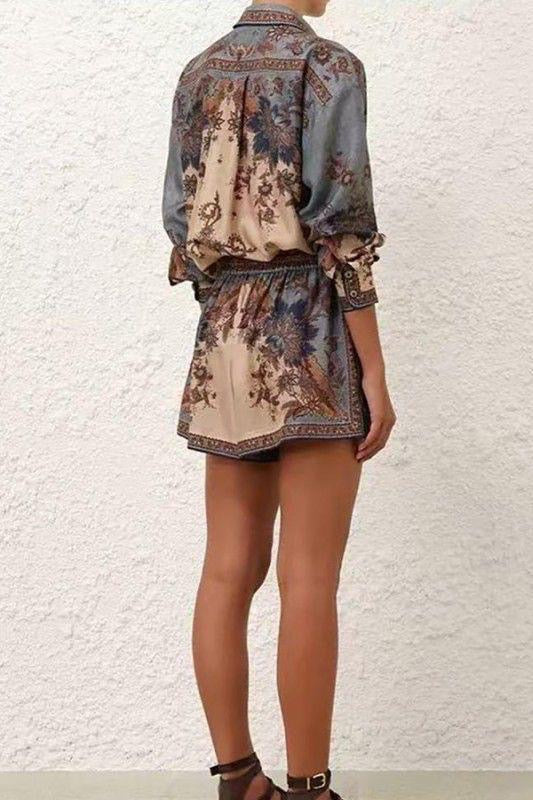 Button down top with matching shorts. Elastic waist and drawstring.